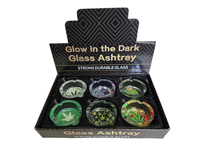 AshG028N, Glow in the Dark Round Glass Ashtray, Leaf Designs, 6pcs/Tray, $3.00/Pc